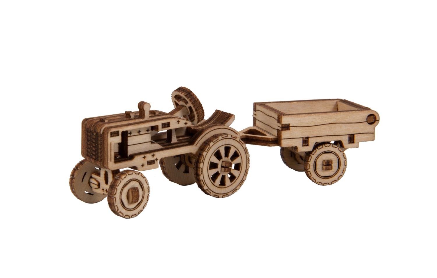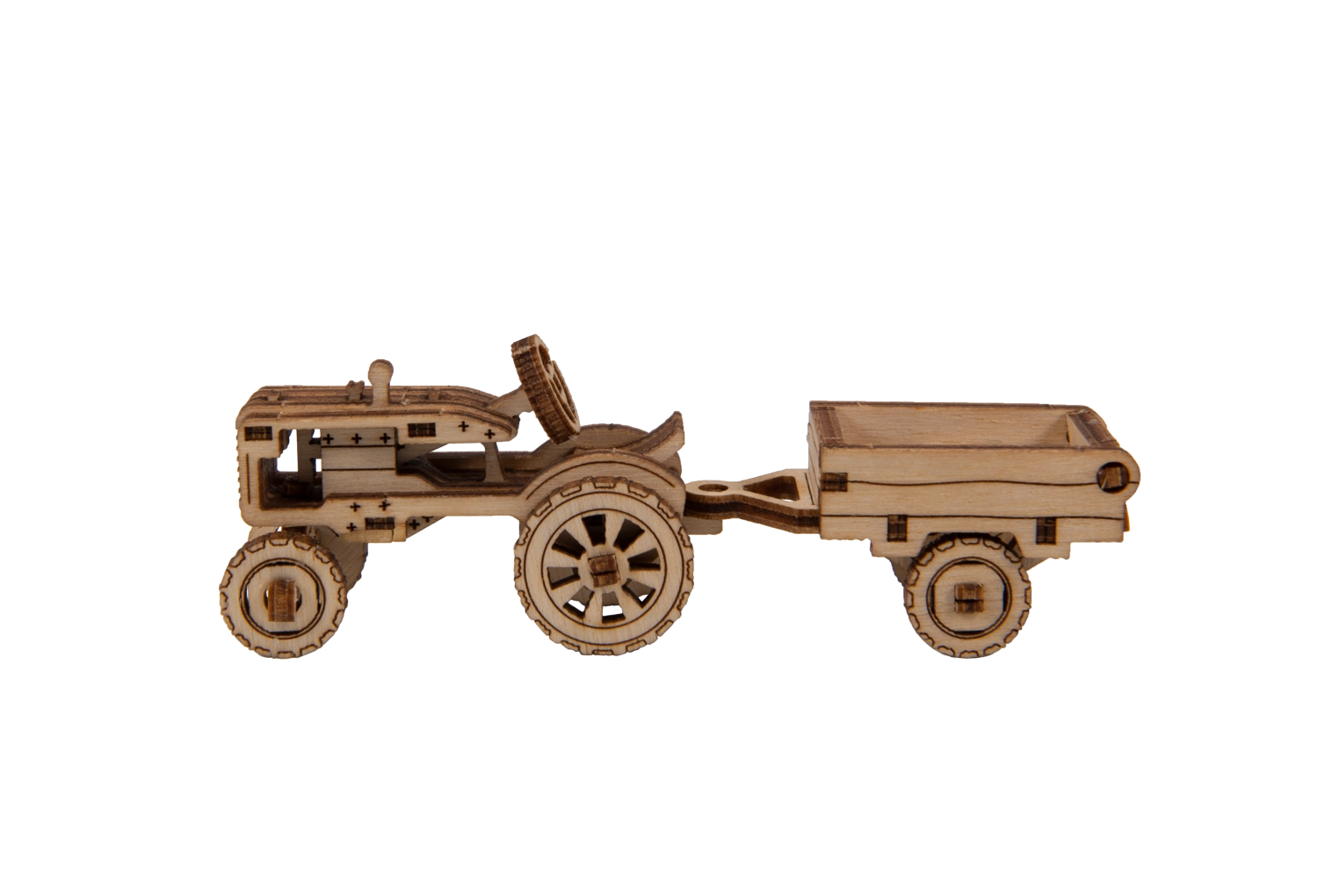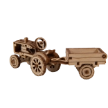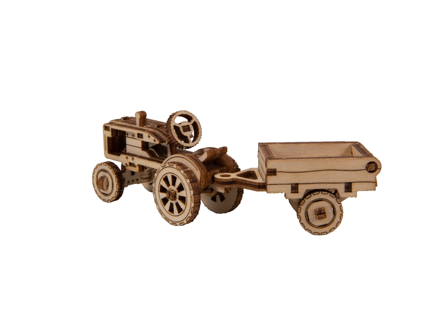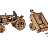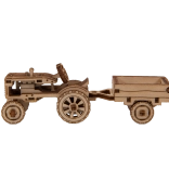 The tractor model with trailer has moving wheels and rich engraved details. The trailer can be tilted—ideal as an eye-catching wooden decoration.