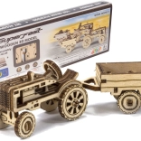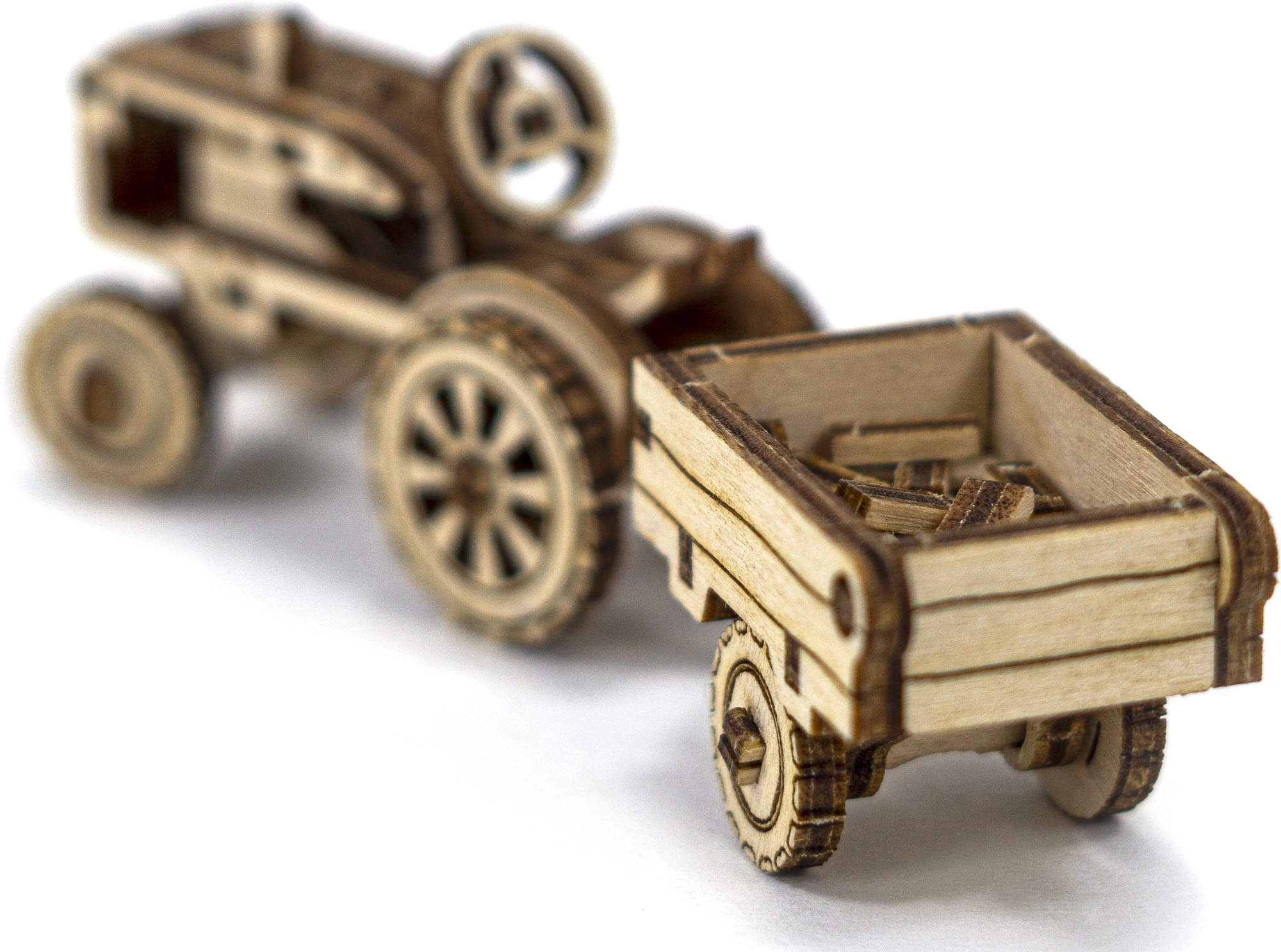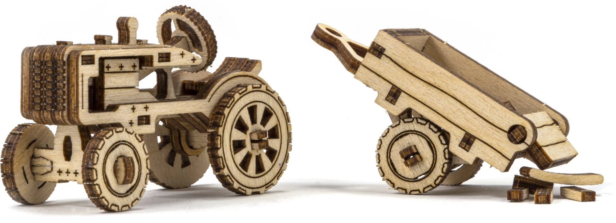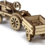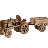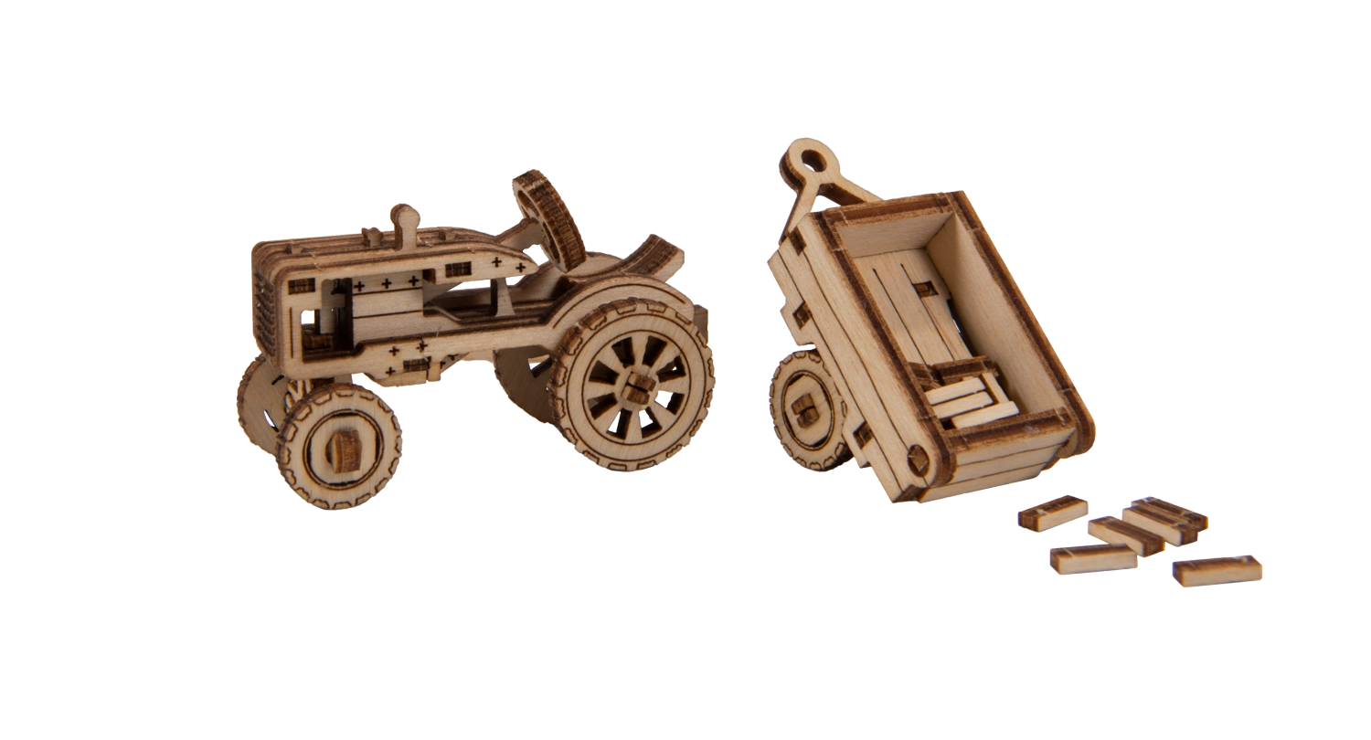 The tractor model with trailer has moving wheels and rich engraved details. The trailer can be tilted—ideal as an eye-catching wooden decoration.