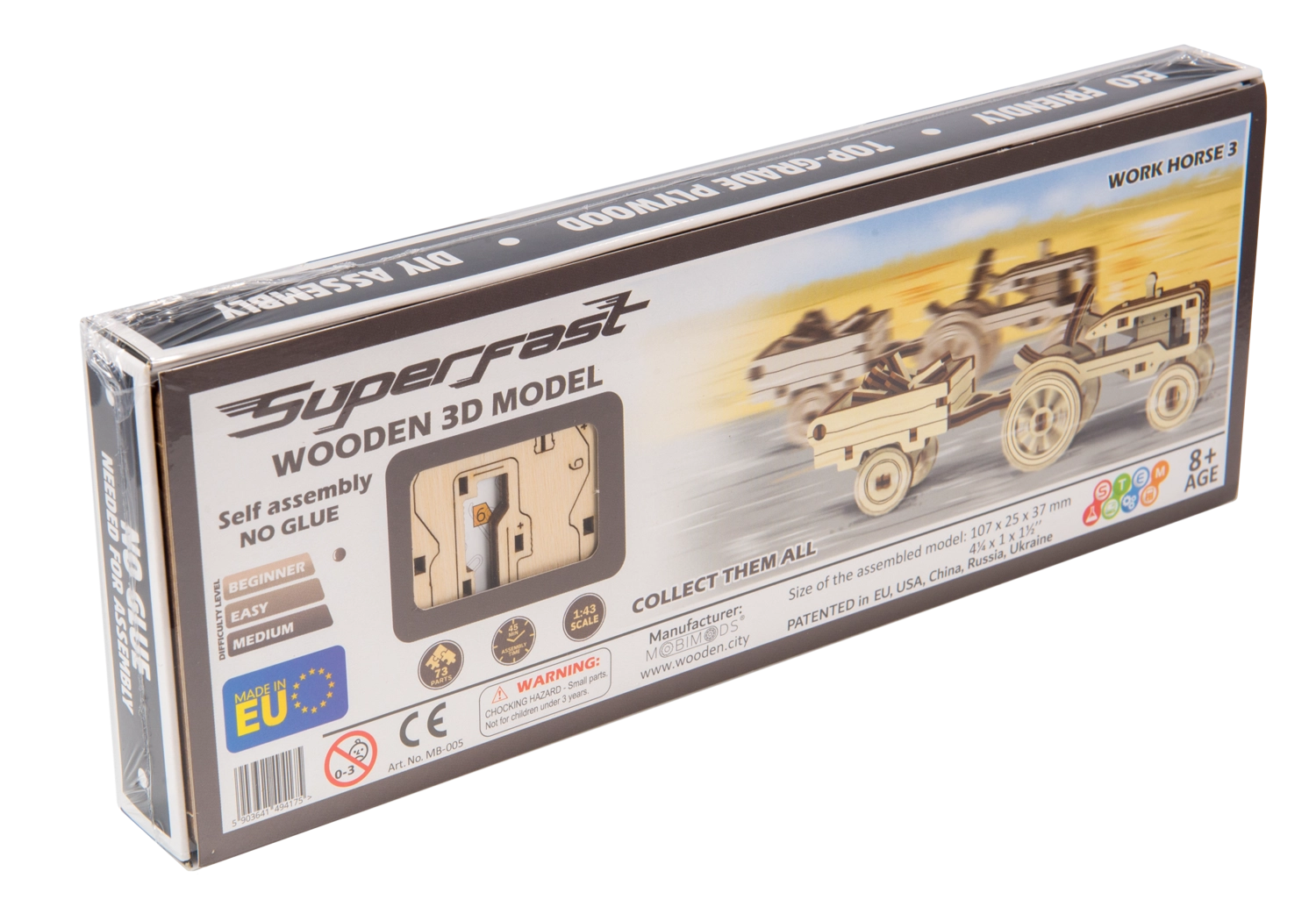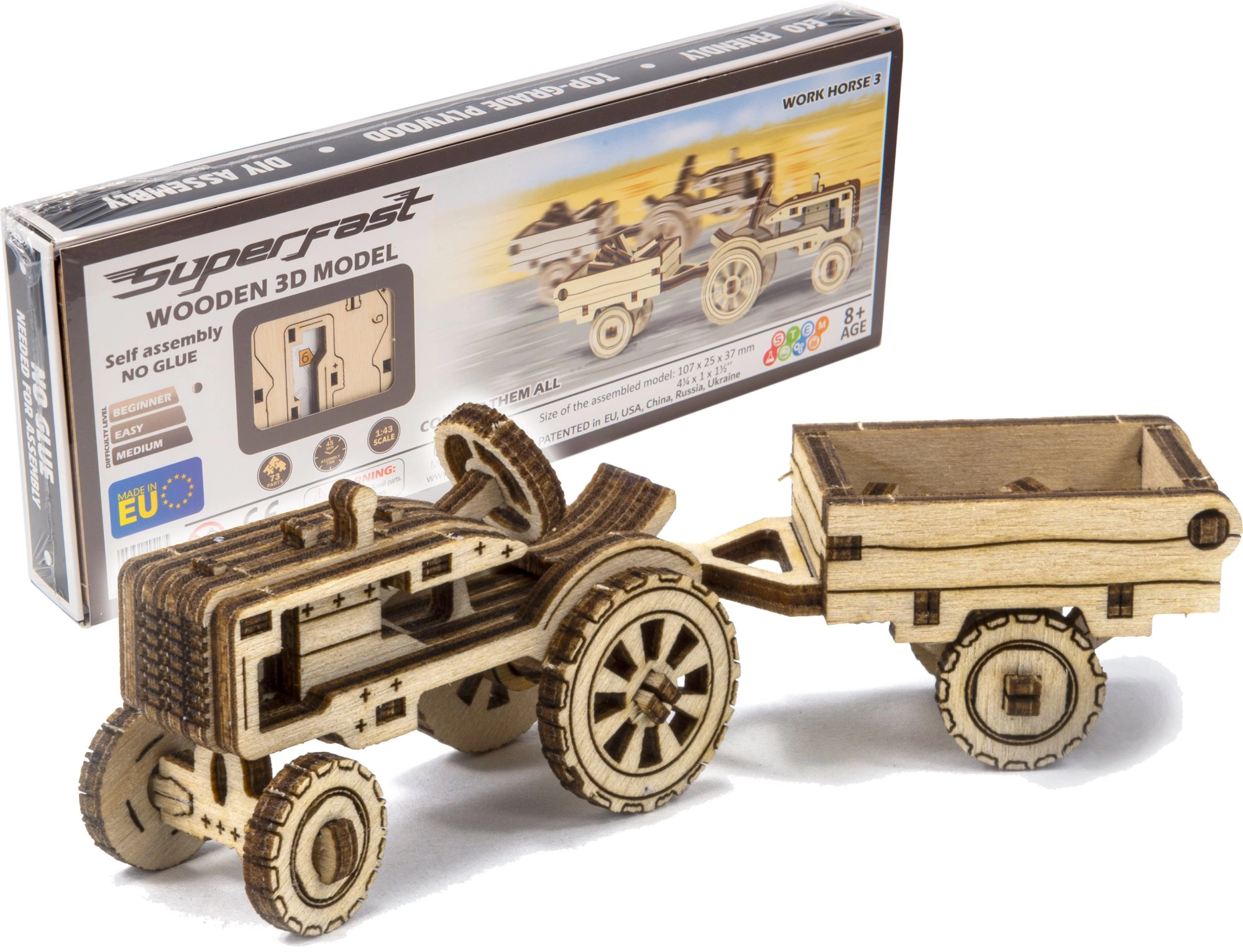 This precisely crafted model “Work Horse 3” is inspired by famous American tractors and offers an attractive blend of creative fun and relaxation. The parts are laser pre-cut, so you don’t need glue or screws—everything fits together cleanly, resulting in a realistic tractor with a tilting trailer.