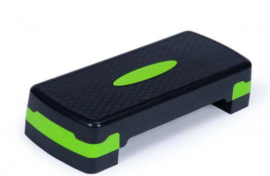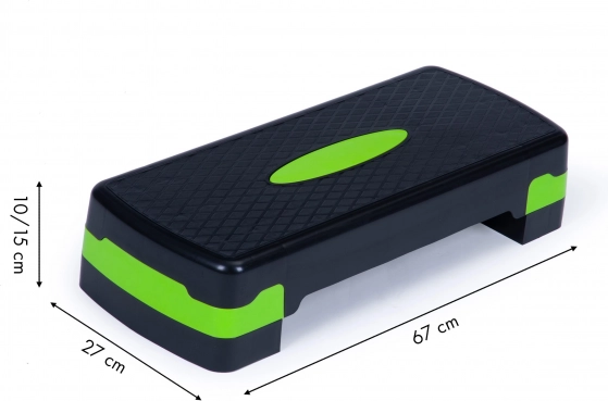 Universal fitness step for home workouts with a height adjustable to 10/15 cm, a non-slip surface, and rubber feet for maximum stability. Lightweight yet durable construction absorbs impact and is ideal for aerobics, interval, and strength training.