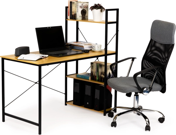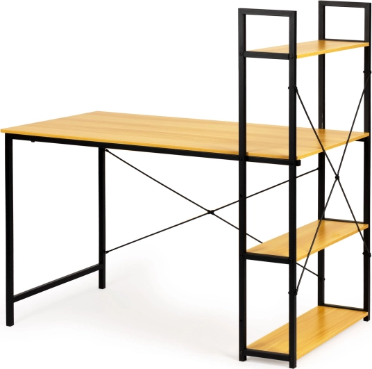 The desk offers a spacious work area and a side stand with four shelves for storing books, documents, or decor. The entire structure is designed for durability and long service life, thanks to materials such as MDF board and powder-coated steel.