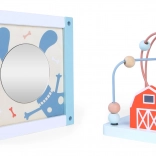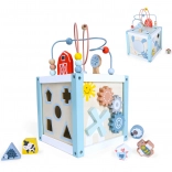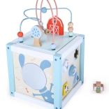 The cube is equipped with a bead maze, a mirror, and rotating gears that develop children's fine motor skills.