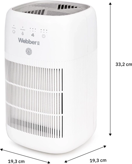 The Webber dehumidifier and air purifier combines modern PureAir technology with efficient dehumidification to reduce indoor humidity, limit mold growth and window condensation, while filtering dust, allergens, and odors. The three‑stage filtration (pre‑filter, carbon filter, and HEPA 13) captures up to 99.97% of particles ≥ 0.3 µm—an ideal solution for allergy sufferers and families with children.