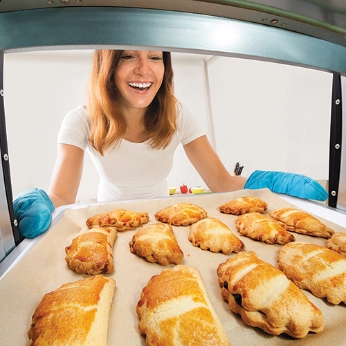 The motorized spit rotates the food throughout baking. Chicken, roulades, or skewers will be evenly cooked and beautifully golden.