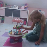 An adorable kids' ice cream cart that turns any room into a little sweet stand. It offers up to 36 accessories, a rotating display shelf, and plays a melody with light effects in the umbrella. Thanks to the wheels and handle, it’s easy to maneuver, supports creative play, shopkeeper and customer role-play, and develops fine motor skills and early counting.