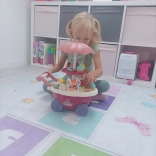 The cart is made of quality plastic, has smooth-rolling wheels, a push handle, and a decorative umbrella with lighting. Compact dimensions make it easy to handle at home and on visits. The play encourages imagination, communication, and social skills.