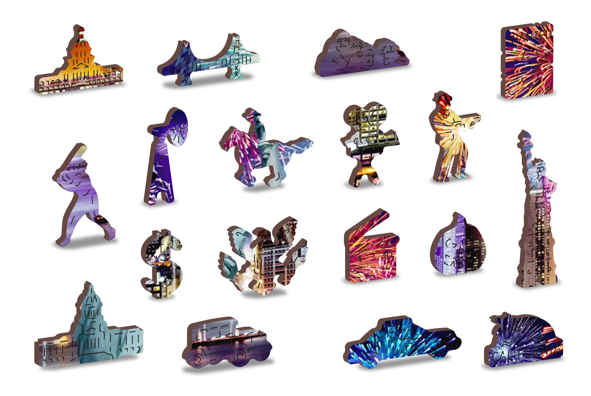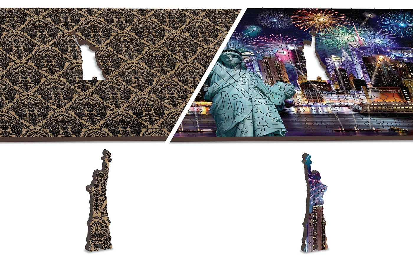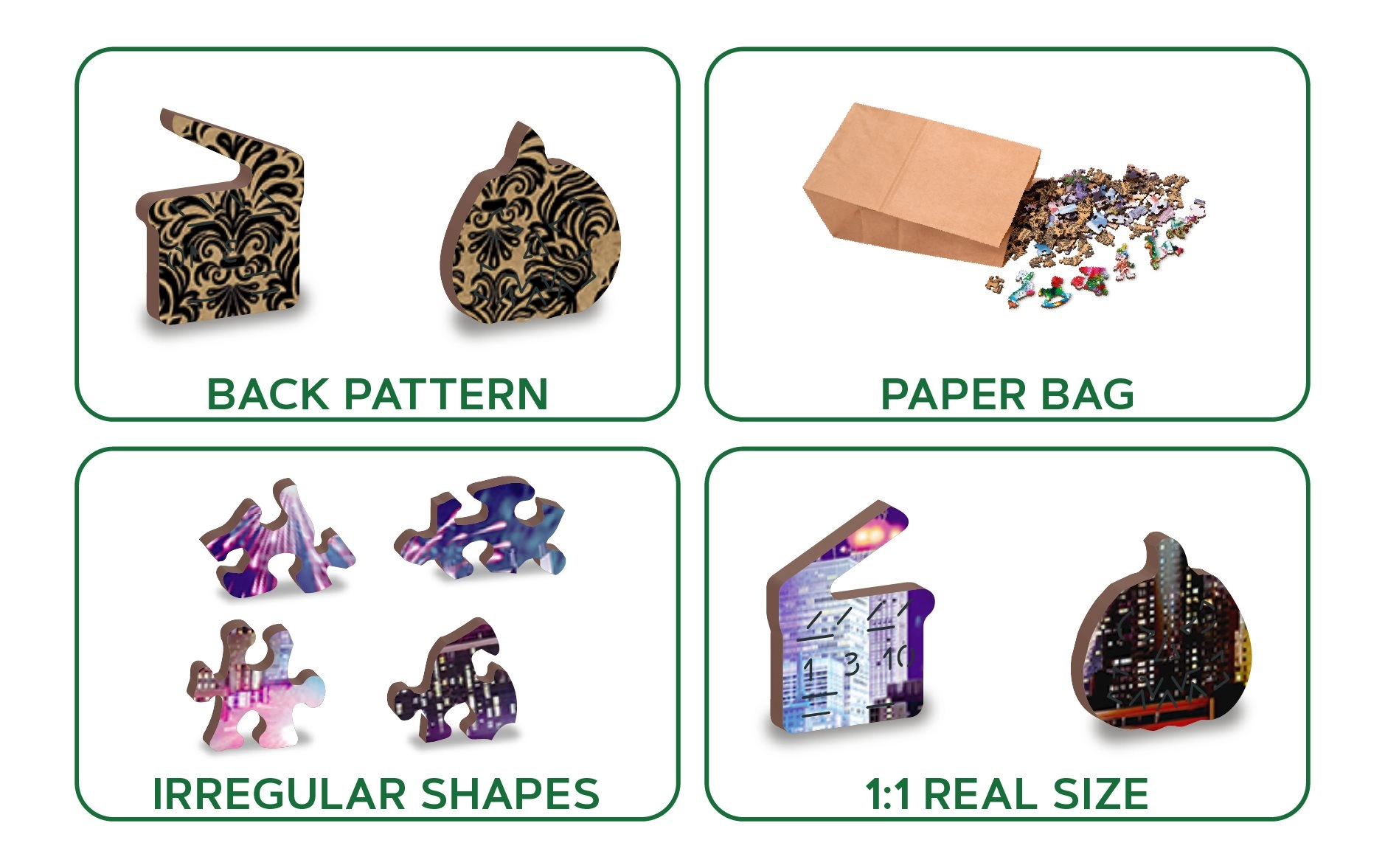 Embark on a journey to Night New York with our luxurious 2in1 wooden puzzle. Carefully cut from precise material, this puzzle offers uniquely shaped pieces that independently form animals, objects, or buildings while remaining environmentally friendly.