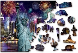 The wooden puzzle "New York at Night" offers an unforgettable assembly experience for all puzzle enthusiasts. Each of the 200 pieces is precisely laser-cut from high-quality wood, ensuring durability and precision. The front of the pieces is adorned with detailed images, while the back carries a wallpaper pattern for a higher aesthetic experience.