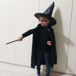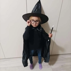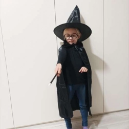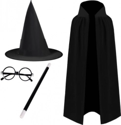 This stylish wizard costume includes everything kids need to create a striking and safe outfit. The lightweight cape made of pleasant material flows elegantly and stays in place thanks to the tie closure. The pointed hat pops open by itself after unpacking for a wow effect. The round, lensless glasses are comfortable and safe for play, and the durable plastic wand perfectly complements every trick.
