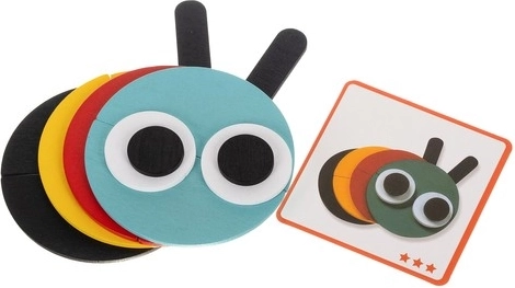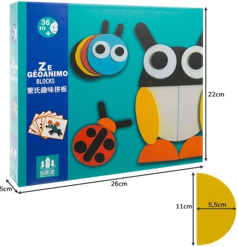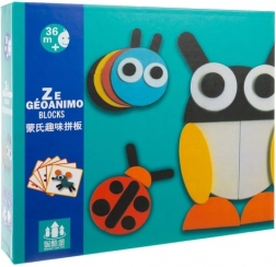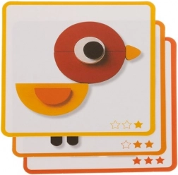 Discover the magic of learning through play. This wooden puzzle combines geometric shapes and vibrant colors so kids can easily create animal motifs following the included templates. The cards are marked with stars and guide children step by step through three difficulty levels.