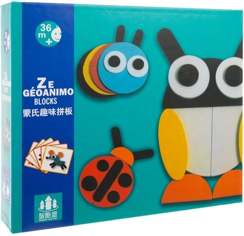 A colorful wooden puzzle with animals made from geometric shapes develops children's imagination, creativity, and fine motor skills. Children assemble according to cards in three levels of difficulty, training logical thinking, focus, and patience. Durable wood and a practical carry pouch make it a lasting educational toy for everyday use.