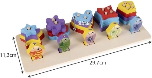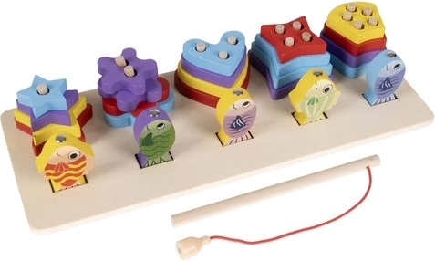 The sorting box includes five shapes and the first row is designed for fishing games, which develop concentration skills.
