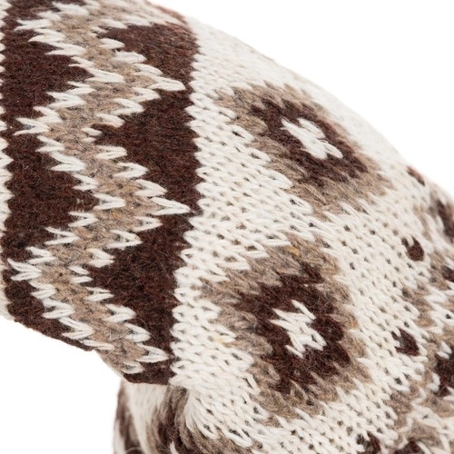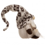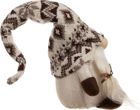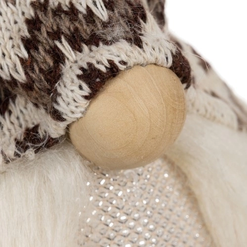 The gnome with a knitted patterned hat and faux fur offers a cozy rustic look, ideal for festive decor.