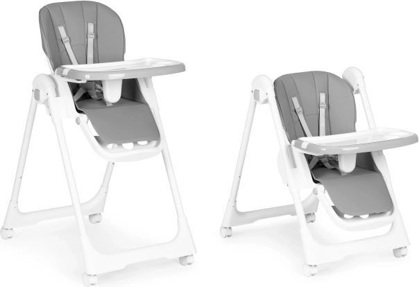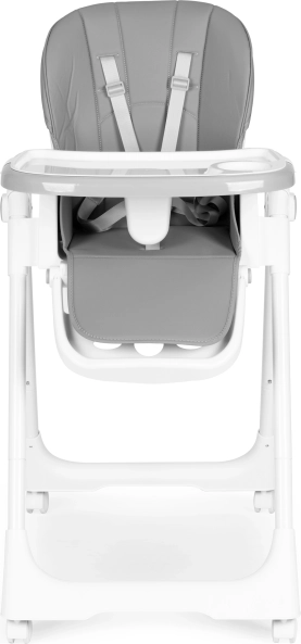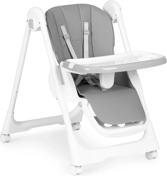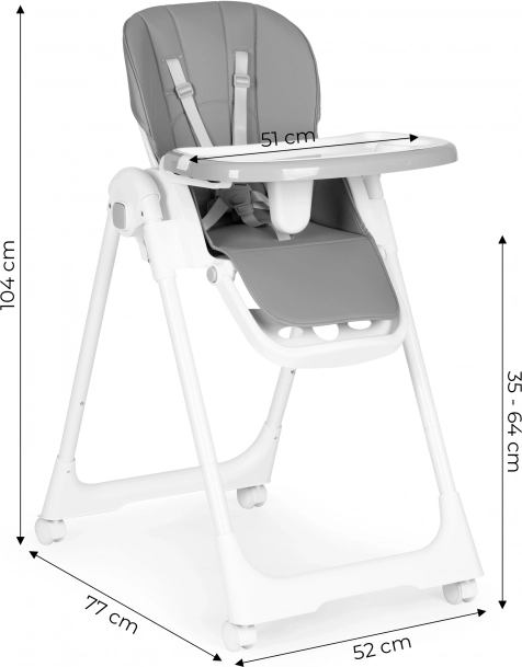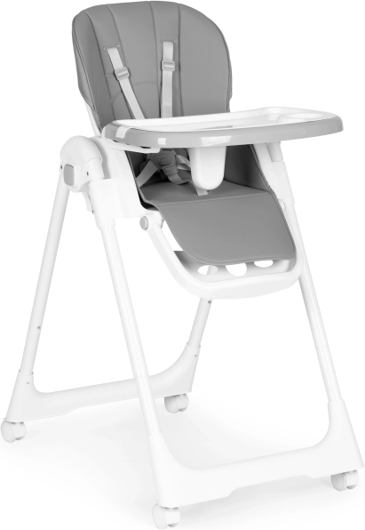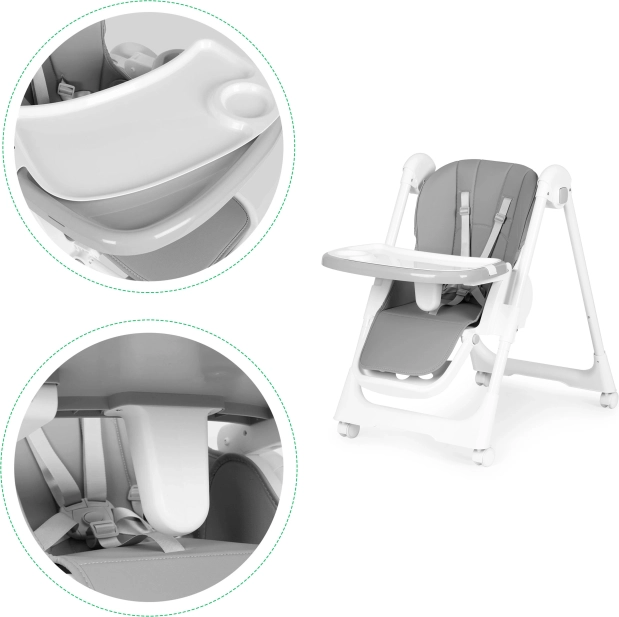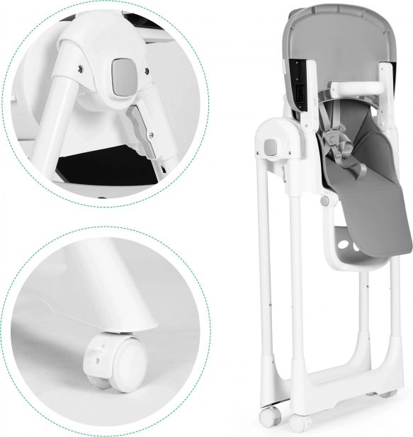 The metal frame folds quickly to save space, and wheels with rubber treads and brakes make it easy to move without scratching floors. A 5-point safety harness and a crotch stop under the tray enhance safety. The eco-leather upholstery is durable and easy to wipe clean—ideal for everyday use.