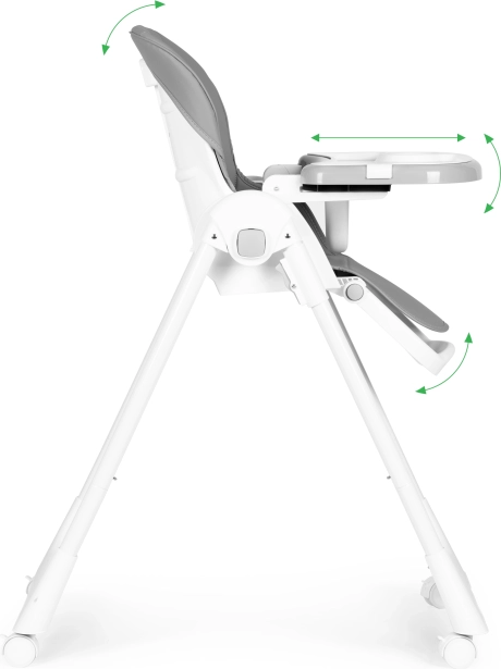 Thanks to the backrest adjustment from upright to an almost reclined position, the adjustable footrest, and the sliding tray, you can easily adapt the chair to current needs. The double tray has raised edges and a cup holder; simply remove and clean the top layer after meals, while the flat lower surface is perfect for drawing or play.