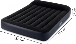 The INTEX velvet mattress with dimensions 191 x 137 x 25 cm is ideal for 2 people. It is made of durable PVC material, with the top covered in a water-resistant velvet finish that is pleasant to the touch. The elegant dark blue color fits any interior. Thanks to the built-in electric pump (220–240 V), the time needed to prepare the air bed for use is 250 seconds. With the Boston valve, you can deflate it within a minute, fold it, and store it in a closet.