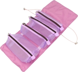 No more chaos in your toiletry bag. This 4-in-1 roll-up cosmetic organizer offers four spacious, transparent zip pockets that can be removed and rearranged as needed thanks to hook-and-loop fastening. Once packed, it is secured with elastic straps and stays neatly together.