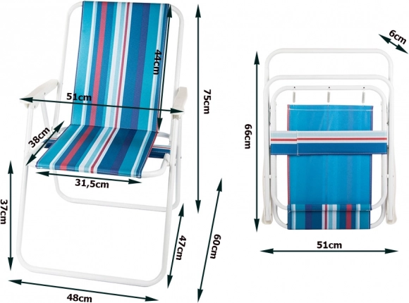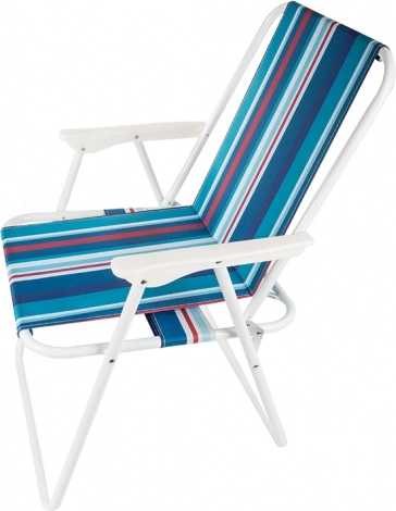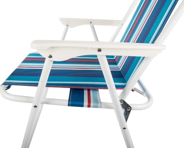 This folding beach chair combines low weight, easy carrying, and proven comfort. The powder-coated steel frame ensures stability, while the durable fabric of the seat and backrest feels pleasant to the touch and is easy to clean. Comfortable armrests support relaxation even during longer sitting.