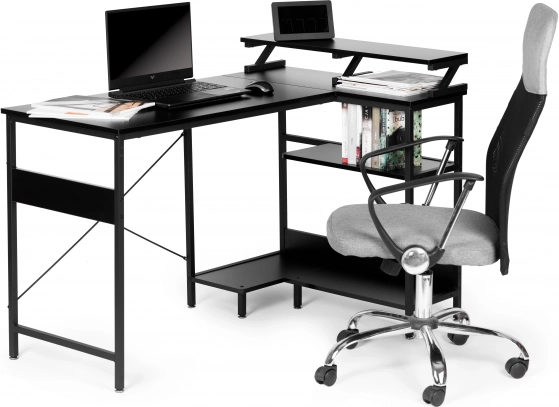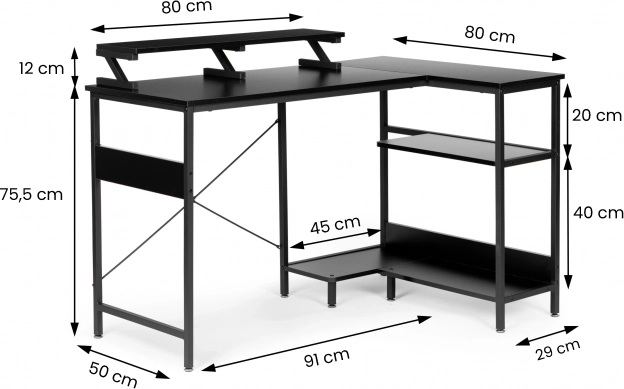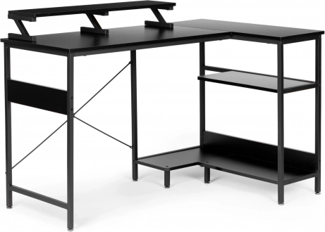 The large surface of both tops provides space for all essential office supplies. The desk also features two functional shelves that hold everything you want within reach.