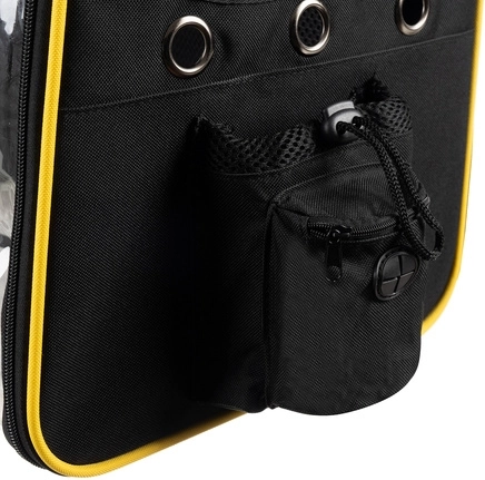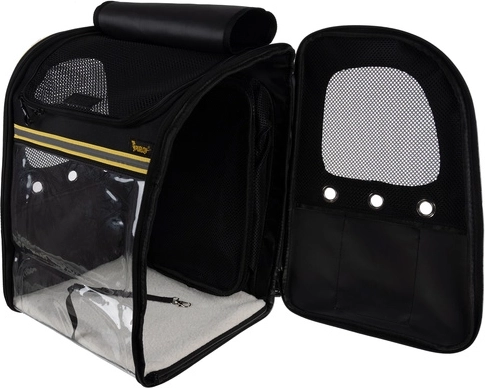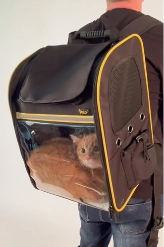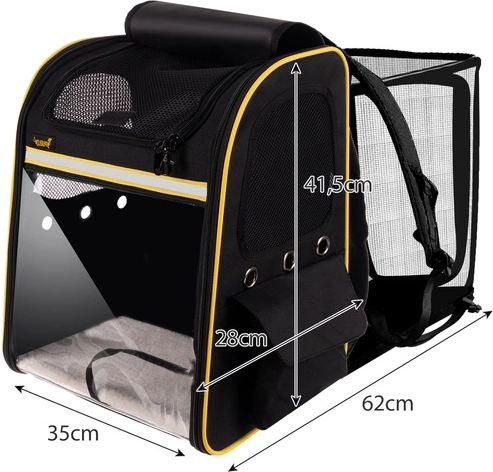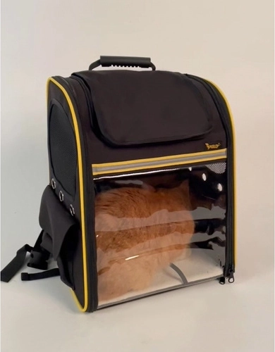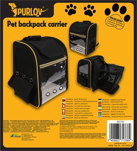 The stylish Purlov backpack carrier with a transparent window and expandable space offers your pet safety and comfort on the go. It features ample ventilation, an internal safety clip, a reinforced bottom, and comfortable straps with chest and waist belts for easy carrying.