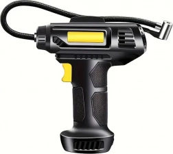 With a compact and ergonomic design in a black-yellow color scheme, the compressor facilitates usage on the go and allows for comfortable handling.