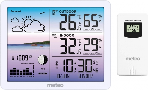 The weather station displays weather pictograms, moon phases, and a comfort index, so you immediately know the current conditions and what to expect in the next few hours.