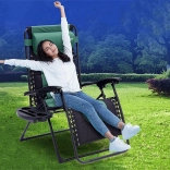 The lounger includes an adjustable headrest, ergonomic armrests, and a practical side table for drinks and small items.