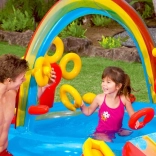 The Intex inflatable water play center combines a shallow pool, a slide, and interactive elements into one colorful fun hub. The rainbow arch with spray creates a refreshing water curtain, letting kids safely slide down onto a soft landing pad. Two water zones with different depths are ideal for various age groups.