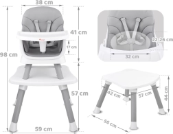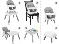 • 6 in 1: high chair with tray, dining chair booster, low chair with tray, chair + table, play table with brick board, low stool/ottoman