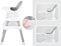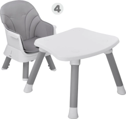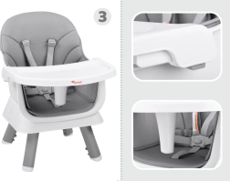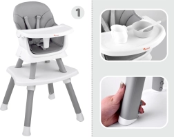 A practical 6-in-1 children's high chair that grows with your child from 6 months. It features a modular design, secure 5-point harness, easy-to-clean and breathable upholstery, a removable tray, and non-slip feet. Thanks to multiple configurations, it serves as a tall and low chair, a booster for a dining chair, a standalone chair with a table, and a brick play table.