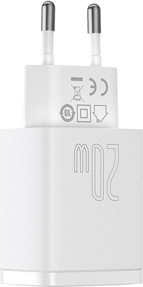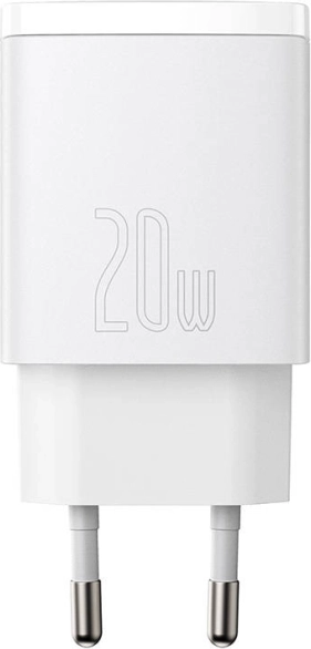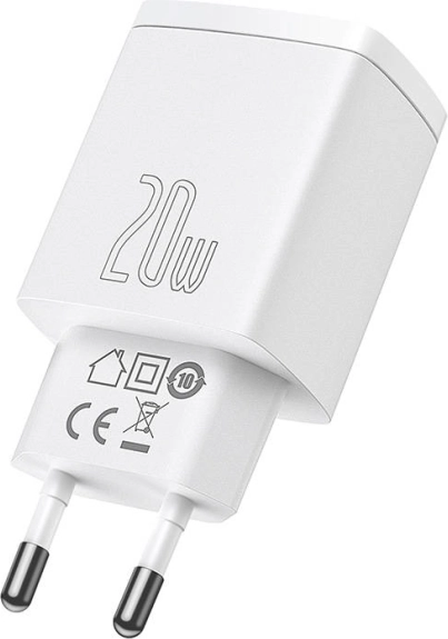 The compact Baseus charger with 20 W output offers fast PD 3.0 and QC 3.0 standards, two ports USB‑C and USB‑A for simultaneous charging, intelligent protections, and a durable PC housing. Perfect for home, office, and travel.