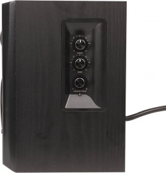 The set includes remote control for convenient sound management from the sofa and adjustable control knobs for bass, treble, and overall volume directly on the speaker.