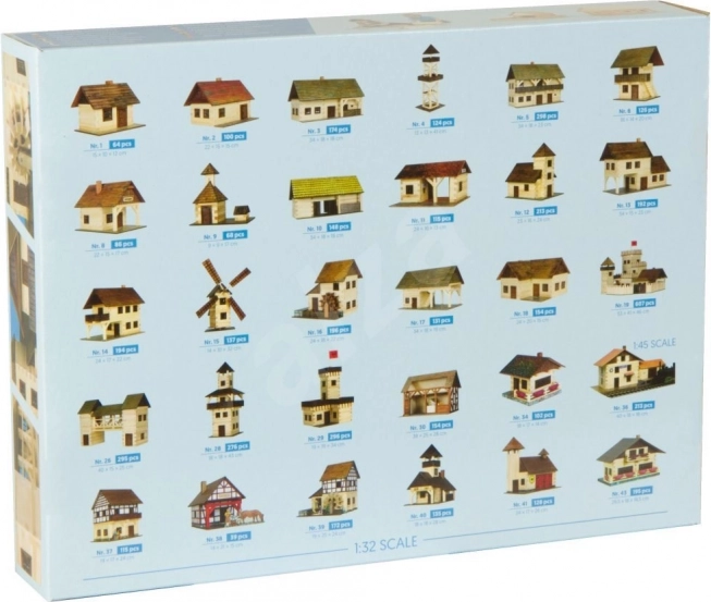 • Package includes: wooden beams in specified lengths, parts for roofs and gables, cardboard cutouts for windows and doors, pre-printed paper textures, schematic assembly plan.