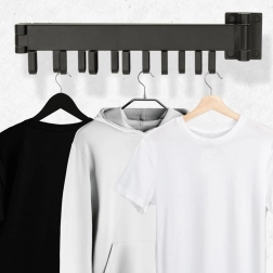 The elegant wall-mounted dryer in matte black suits both small and larger spaces. With four folding arms featuring adjustable angles and telescopic extension, you can easily tailor the drying area to your current needs. The sturdy aluminium construction ensures long-lasting performance indoors and on balconies.