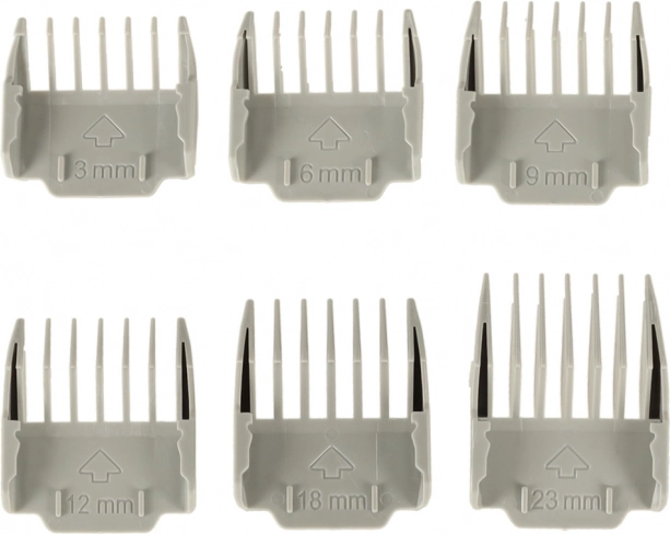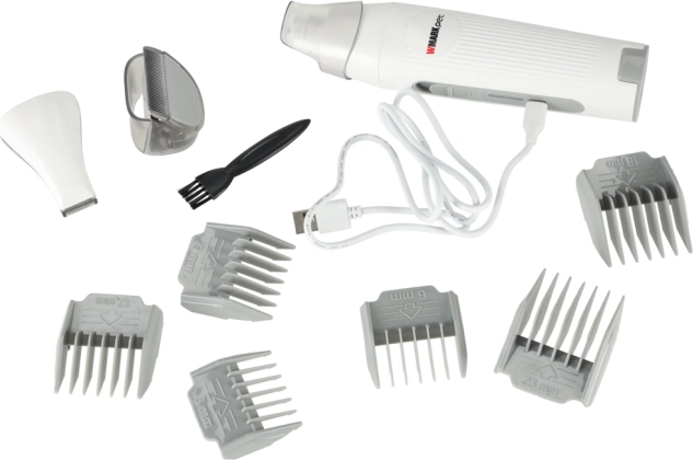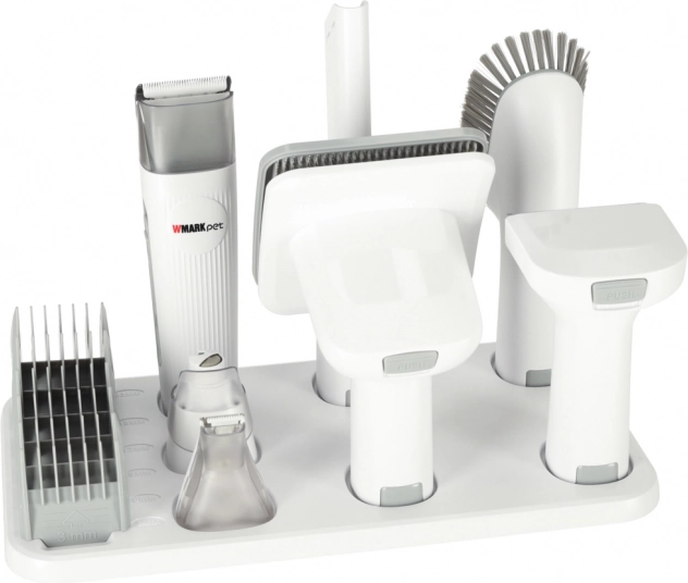 The cordless WMARK Pet clipper with 6 comb guards (3–23 mm), brushes, paw trimmer, and nail file — all in one set.