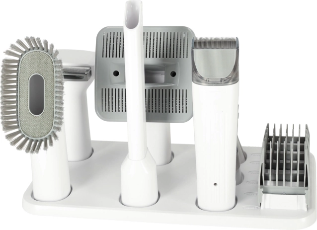 The set includes a cordless hair clipper with six guards (3–23 mm) for precise coat shaping, de-matting brushes, and paw and nail care tools. Three suction modes are easy to tailor for sensitive animals, while an effective filter helps reduce dust and allergens in your home.