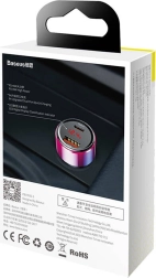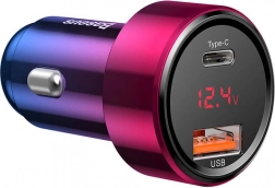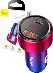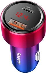 The compact BASEUS car charger with up to 45 W of power quickly and safely charges your phone, tablet, or navigation device. It offers USB‑C and USB‑A ports for charging two devices simultaneously, support for QC 4.0, PD 3.0, PPS and other protocols, and an integrated digital display to monitor voltage.
