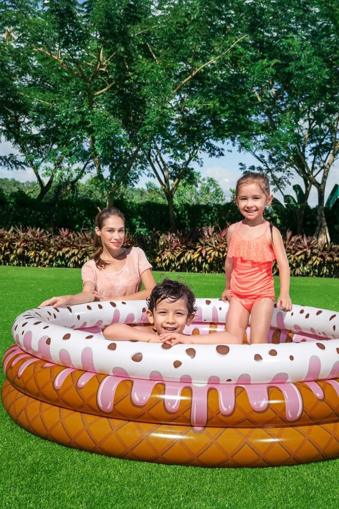This cute inflatable pool with a donut theme from BESTWAY brings hours of summer fun in the garden for kids aged 2+. With dimensions of 160 × 38 cm, three rings, and soft walls, it offers comfortable support, safe play, and quick inflation and deflation. Durable PVC material and a capacity of approx. 390 l ensure stability and longevity for water play.