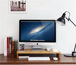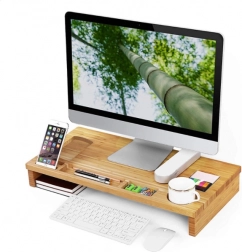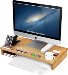 An elegant bamboo monitor stand raises your screen to an ergonomic height while doubling as a practical organizer. It offers compartments for your phone, pens, and small items, a designated mug spot, and space for a keyboard and mouse under the stand. The natural look and durable bamboo keep your desk tidy and support better posture while working.