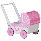 DESIGN: The stroller is made of wood and comes in a pleasant color combination. The white body is decorated with pink hearts. The wheels, canopy, and inner lining are also pink.
