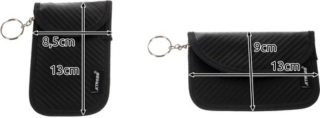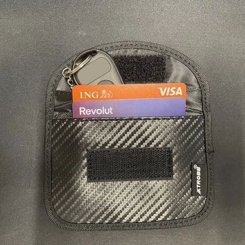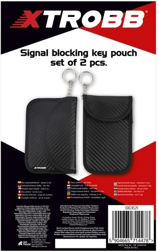 Protect your keyless car from “relay attacks”. This set of two XTROBB pouches reliably blocks radio signals and protects keys and payment cards. Durable PU and polyester materials, two pockets in each pouch, quality hook-and-loop (Velcro) closure, and a practical key ring. The package includes one pouch with a vertical opening and one with a horizontal opening for maximum convenience.