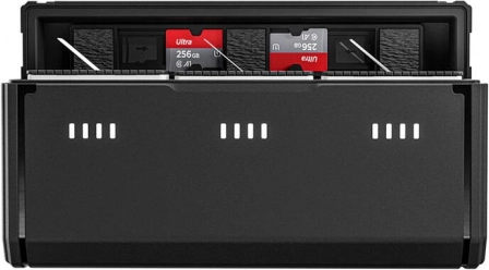 Support for a 15 W USB‑C input allows you to charge three batteries in approximately 2.5 hours. Each slot has a separate LED status light.