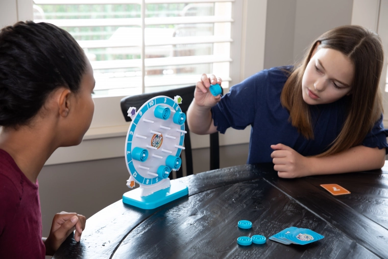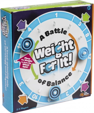 The Fat Brain Weight for It board game combines simple rules with exciting strategy. The goal is to place weights so the number on the rim of the wheel lands exactly on the value shown on your card. Every choice of position and weight size affects the balance — the winner is the one with the best estimation and a cool head.