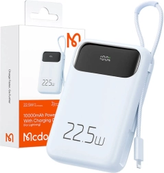 The compact Mcdodo power bank with a capacity of 10,000 mAh and fast charging of 22.5 W reliably charges your phone and accessories on the go. It charges up to 3 devices simultaneously, supports PD 3.0, QC 3.0 and 22.5W SCP, has a clear LCD display, an integrated lanyard for easy carrying, and meets aviation safety standards.