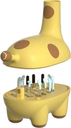 A stylized container in the shape of a horn serves as a practical storage space for all attachments, adding a touch of playfulness and functionality.