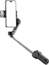The gimbal is lightweight and easily portable thanks to its foldable design. The integrated 205mm extendable rod allows for a wider shot and remote control can be used separately or attached, where it also charges.