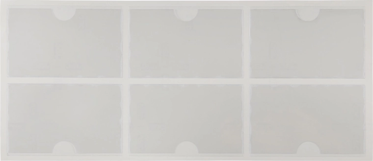 Practical self-adhesive business card pockets with top loading protect your cards and labels, feature a self-adhesive backing for quick installation on smooth surfaces, and are clear for perfect readability. Supplied on a sheet of 6 pcs.