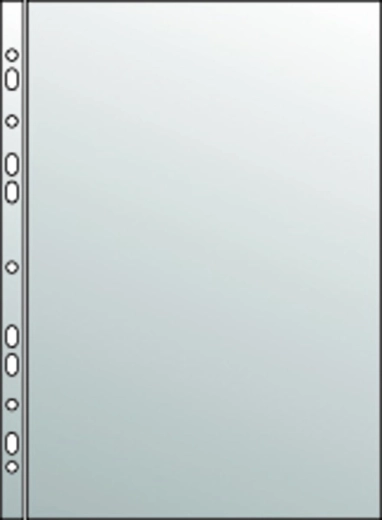 Practical A4 sheet protector with a universal filing strip for binders. Made of durable polypropylene, it offers a smooth glossy surface, 80-micron thickness, and top-loading for easy handling and protection against dirt and creasing.