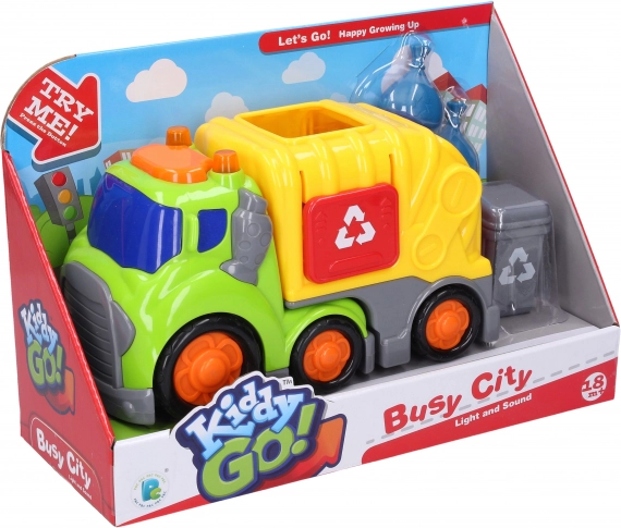 Discover the fun with the Kiddy garbage truck, 19.5 cm long, featuring light and sound effects, moving doors, and an opening bin. Just press the button on the cabin roof and the play begins! It also includes free-rolling wheels for smooth movement and complete accessories for realistic play.