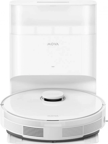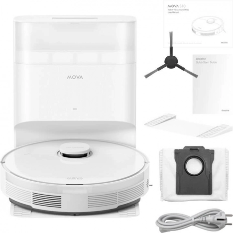 The MOVA S10 Plus is a smart robot vacuum with mop that effectively cleans hard floors and carpets. It offers 7,000 Pa suction power, automatic power boost on carpets (Carpet Boost), and a vibrating mop with up to 3,500 vibrations/min. The DualBoost 2.0 auto-empty base stores dust in a 4 L bag with 99.7% filtration efficiency and provides up to 90 days without manual emptying.